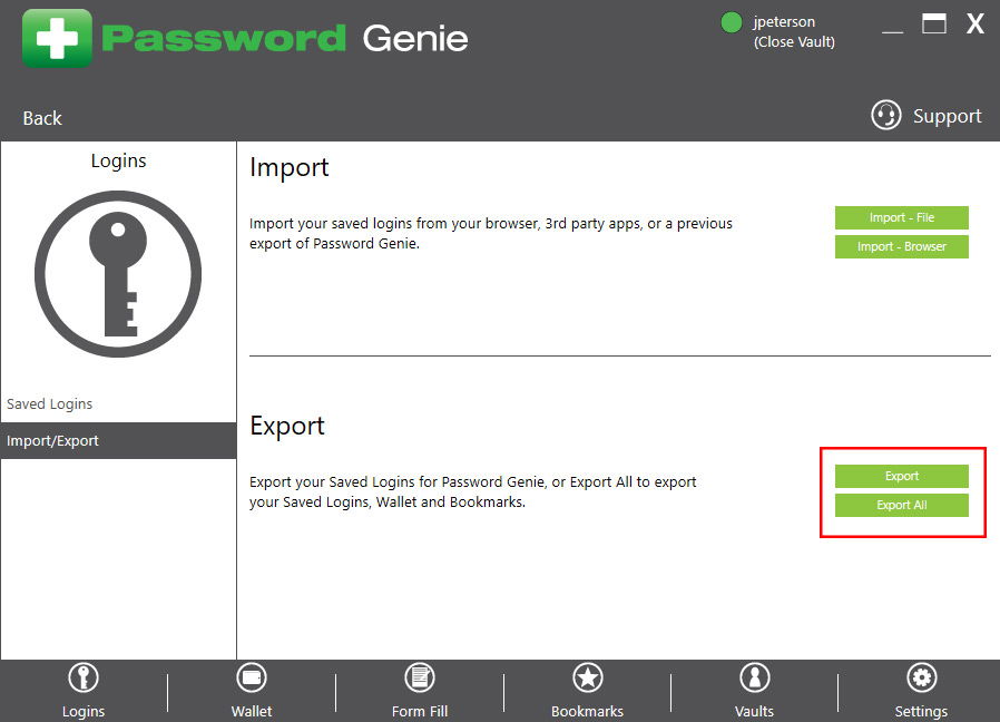 4. To Export all your entries (i.e. Logins, Wallet, Form Fill, Bookmarks, etc.) in Password Genie, across all categories, click “Export All”. Each category will be exported into individual CSV files with all information from each entry.
